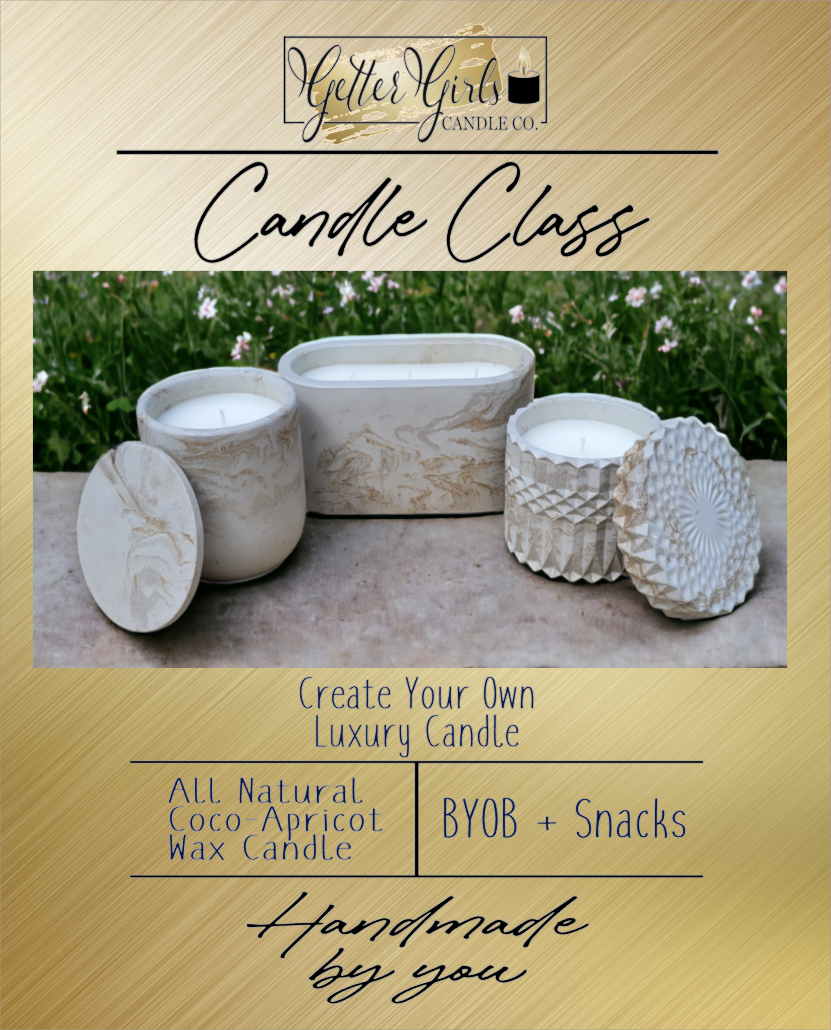 Create your own candle from start to finish! Start with one of our high quality concrete vessels, select from our many fragrances and then create your candle. We offer a celebratory glass of champagne but feel free to bring your own drinks and snacks. We will also play games and give away prizes. Come to one of our classes or contact us to host your own!